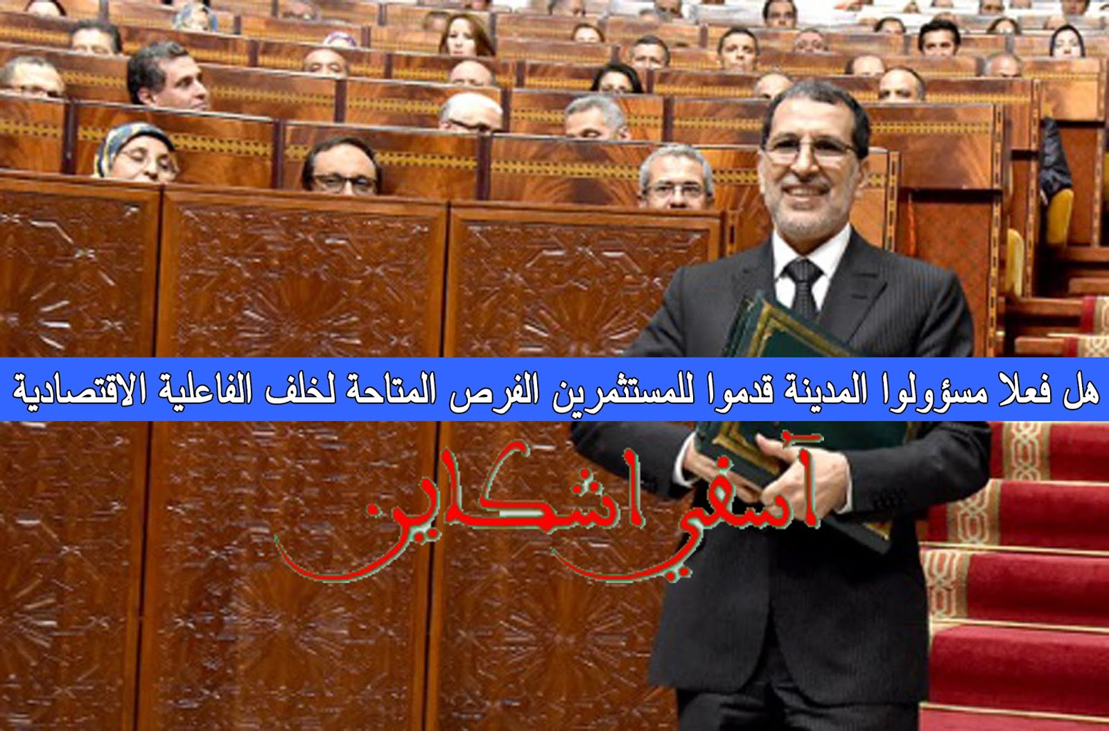 في الوقت الذي خرج الجميع يتغنى باليوم الدراسي الذي عقده المركز الجهوي للإستثمار بأسفي، والكل خرج مطبلا مزمرا بأن أسفي هي القطب الأكثر جاذبية، لخلق فرص الإستثمار وجلب للمقاولين والمستثمرين باعتبار المدينة هي البوابة البحرية لجهة مراكش-أسفي، نجد حكومة سعد الدين العثماني تصادق صباح يوم الأربعاء 10 يناير 2018 بمقر رئاسة الحكومة، في اجتماع للجنة الوطنية للاستثمارات تم خلاله المصادقة على 48 مشروع اتفاقية وملاحق اتفاقيات استثمار، يبلغ حجم استثماراتها 32.32 مليار درهم من شأنها توفير 6190 منصب شغل مباشر 13952 منصب شغل غير مباشر.